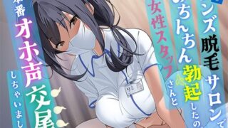 ■作品紹介メンズ脱毛サロンでVIO脱毛(おちんちん周辺の脱毛)をしてもらっている最中に、女性スタッフのリサさんに勃起おちんちん見られちゃいました。あまりのチンポの反り返り具合に脱毛がしにくいのだとか、ほんとぉ?初めは手コキ射精で鎮めてもらい、徐々にエスカレートしてフェラチオ→本番生ちんぽ交尾まで……どうやらチンカスこびりついた包茎ちんぽがお好みの様で、洗ってない不潔ちんぽ見せつけ、匂いで即イキ潮吹きブシャーさせた後は、生ちんぽ挿入で膣口ぞりぞり中出し射精!まだ若いのにお下品オホ声上げながら、おしっこアクメ決めさせてやりましたよ。おっ…おっおっ…おぉぉおぉぉおおぉお…おんっ…んおっ…いっぐ…いぐいぐ…いぐっ!んおおっ!VIO脱毛の施術中に、手コキ、耳舐め、本番中出し、おしっこ、潮吹き、オホ声おなら交尾、などなど…どすけべ淫乱発情期丸出しラブラブエッチでお下品オホ声交尾するお話です。全編高音質バイノーラル録音・ダミーヘッドマイク録音でお贈りします。■キャラクター紹介リサCV:分倍河原シホ・メンズ脱毛サロンの女性スタッフ・年齢は22歳・趣味は温泉めぐり・セックスはご無沙汰■アピールポイント+購入特典ドすけべイラスト!本作品は分倍河原シホさんのドスケベでお下品なオホ声ボイスをご堪能いただけます。ちんぽの匂いを嗅ぐと性格が淫乱になり、オスちんぽを求めてくるドエロさは必聴です。潮吹き、おしっこ、中出し、おなら、などのスケベSEも搭載!おまけトラックで耳かきボイスも収録!販売日から30日の間、35%割引セール!■トラックリスト 全8トラック 約108分01 VIO脱毛中におちんちん勃起したので手コキで抜いてもらったw (13:44)02 VIO脱毛中におちんちんまた勃起したので今度はフェラで抜いてもらったw (15:18)03 VIO脱毛中に女性スタッフが発情したので、そのまま本番までしちゃいましたw (17:03)04 VIO脱毛中に耳舐め囁き手コキローションマッサージでちんぽミルク射精どびゅるりびゅるるw (12:48)05 VIO脱毛中に包茎ちんぽのチン嗅ぎオホ声アクメで潮吹き射精ブシャー! (05:17)06 VIO脱毛中に発情ムラムラ本気交尾中出しびゅるるどっぴゅ!で潮吹きブシャー! (17:58)07 交尾中、続いてアナルけつまんこ処女卒業ファックでオナラぶびっ、ぶびゅ、おしっこシャシャシャー! (03:57)08 おまけトラック耳かきボイス 美容系彼女の診察あまあま耳かき (22:42)■収録時間、収録環境全8トラック 約108分ファイルはWAV、mp3同梱です。WAV(48kHz / 24bit)mp3(48kHz / 320kbps)NEUMANN KU100 ダミーヘッド※より臨場感を味わっていただくため、イヤホン・ヘッドホンのご使用を推奨します。■クレジットCV:分倍河原シホ 様イラスト:古山造 様企画・シナリオ・編集:べけす工房(にゃん太郎)