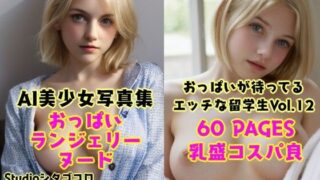 大学の外国人留学生がきれいでかわいい妖精みたい!キミのエロい姿が見たいんだ!そんな気持ちを再現した写真集です(ハーレムもの)1年間365日ベッドで綺麗な可愛い妖精のような美少女のおっぱいが癒してくれる♪清純派のブロンド美女・美少女にフォーカスして厳選した新章突乳!ブロンド外国人女子がドストライクのフェチな人々がひたすら楽しめる美しいエロス★白くて滑らかな柔肌と色素の薄い桜色のおっぱい!がいっぱい!【お試し版フルパッケージ】歴代最高のコスパ良し!『外国人留学生たちが可愛すぎる美少女写真集 Vo1.12〜毎日ベッドに金髪美少女おっぱいが待機している件プチ1〜』は、画像生成AIで特殊なキーワードを入力して生成した画像から厳選した60枚になります。そのため、とても美しい美女・美少女たちの大人っぽい色気や子供っぽい可愛さなど様々な下着姿やヌードのおっぱいを多種多様なパターンで見ることができるので、お楽しみください。シリーズにて「清純派」へ踏み込んだ清くエロいイラスト写真集の第2弾?※画像は、「高画質化(鮮明化、損傷修復、色補正、光補正)」をしております。※この写真集の人物は、すべてAI生成画像であり、実在しません。※この写真集の人物は、すべて20歳以上です。※AI画像生成ソフトによる自動生成のため、細かな部分に乱れがある場合があります。使用しているAIサービス名 : Stable Diffusion画像編集ソフト : メディバンペイント・Pro著者:風水脚本:風水サークル:Studioシタゴコロ