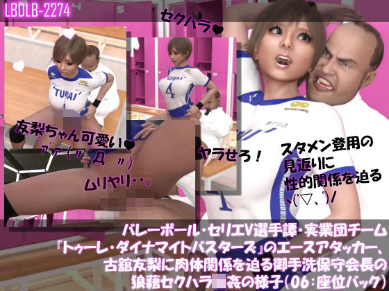 <3DCGによるシチュエーションムービーです。動画1本> 実業団バレーボールチームに所属するセクシーな6人。しかしスタメン登用の見返りにそのスポンサーである御手洗保守会長はそれぞれの選手に肉体関係を迫るという狼藉を働いていました。権力者による最低最悪のセクシュアル・ハラスメントかつ強●性交の実態が克明に描かれていますヽ(゜▽、゜)ノ是非お楽しみください。