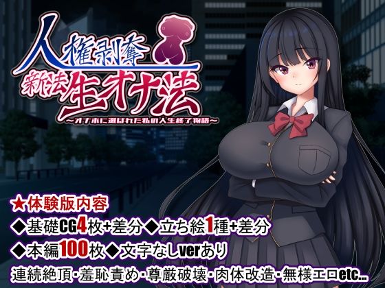 一般女子校生から生オナホに!!物扱いされ尊厳破壊!?連続絶頂の無様エロ!! ●あらすじ 2XXX年 極度のポルノ規制により全ての性風俗コンテンツが廃止され十数年 世の男性達の溜まりに溜まったフラストレーションが爆発 各地で違法行為が蔓延し日本の治安が一気に悪化 これを受け日本政府は新たに 公的性欲解消機関『性活産業省』を設立 それに伴い新法『生オナ法』を急遽可決 『生オナ法』 それは『全国の20歳以上の女性』を対象に 政府が厳正なる抽選を行い、年に数百人の女性を 世の男性達の性欲処理道具『生オナホ』に強●的に任命 それに作り変える事を許可するもの 生オナホに選ばれた女性はその時点で『全ての人権を抹消』され 性活産業省の所有物、つまりは『物』として扱われるようになり 人として拒否することも許されずその人生を性欲処理の道具として 全うすることを強●的に義務付けられる事となる そして、白姫学園に通っていた3年生『天道麗奈』は ある日突如として生オナホに任命され人としての生を終える 果たして彼女は様々な恥辱と快楽を乗り越え無事 人としての尊厳を取り戻すことができるのか!? ●おすすめポイント 本作は巨乳黒髪クール系女子校生が『生オナホ』に選ばれ ある日突如として『人権を失い』『物扱い』されるようになり さまざまな恥辱や快楽責め、肉体改造を施されながら 徹底的に『尊厳を破壊』されるCG集です。 全編通して主人公に醜態を晒させる無様エロ系に特化した作品です。 また、連続絶頂・潮吹き・アヘ顔などの要素が多く含まれています。 人前で痴態を晒しながらも快楽に負けてしまい 悔しいながらもアヘアへしちゃう女の子が好きな方はぜひ見て行ってください。 ●【収録内容】 ■本編307枚 ■基本CG12枚+差分 ■基本立ち絵1枚+衣装表情差分 ■文字無しエロCG158枚 ■本編画像サイズ1920×1440 ●【フォルダ内容】 ■本編.307枚+タイトル画像 ■本編.文字なしエロCG158枚