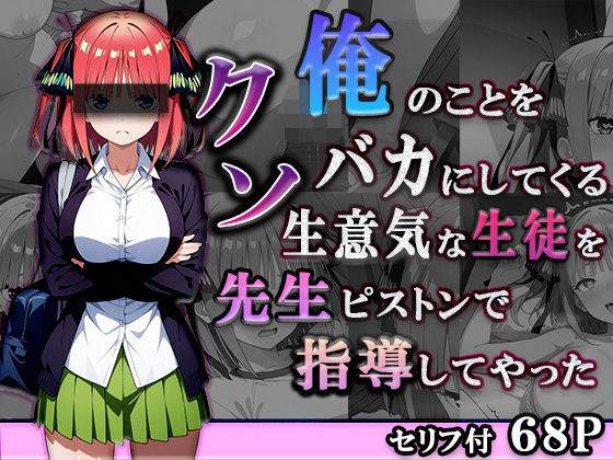 ■あらすじ いつも生意気な生徒を注意したら、スカートをめくってパンツを見せてからかってきた。さらに、俺のことを童貞とバカにしてきた。頭にきた俺はこの生徒を「指導」することに… ■収録枚数 文字有り – 68枚 加筆なし(セリフ、擬音等なし)- 68枚 合計 – 136枚 ■プレイ レ●プ/バック(後背位)/正常位/騎乗位/潮吹き/フェラ/中出し/口内射精 学生服/体操服/全裸 ■仕様 画像形式 : jpg , pdf ■注意事項 ※本作品はAIを活用して作成したイラスト集です。 ※本作品に登場するキャラクターは全て成人済です。 ※本作品は制作にStableDiffusionを使用しています。 ※AI生成の現象で手指などが乱れていることがあります。技術限界などの事情で端々に不自然さが残っていることがあります。また、サンプルと本編は微妙に異なる場合があります。(背景や人物の質感の補正など)。 ※本作は全てフィクションです。登場する人物や設定等はすべて架空のものです。 ※本作品は予告なく販売の中止、価格の変更を行うことがあります。 ※ご購入後の取り扱い等に不備などがあった場合は、一切責任を負いません。 ■禁止事項 ※加工、未加工にかかわらず販売すること。