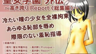 サイトのメインコンテンツである「聖女学園」の外伝という形で、挿絵つきのレポート風スタイルを主体として製作した同人誌です。これまでに出した3作品の再録に加えて、特典作品を収録した総集編となっています。---------------------------------------------------------------------■ 聖女学園外伝 〜高き誇り Prologue〜聖女学園に転校してきた気高き少女、藍沢沙有希。些細なことから罰を受けることになり、裸に剥かれて四肢を拘束されて、もっとも敏感な肉芽を吊り上げられるという、屈辱的な仕打ちを受けることに。そんな沙有希に、襲い掛かるさらなる辱めの仕打ち。身動きの取れない沙有希の股間に強力な媚薬が刷り込まれ、さらに追い打ちをかけるように大量のバイブやローターの挿入やカテーテル挿入、浣腸注入までされてしまう……。■ 聖女学園外伝 〜高き誇り Report〜「聖女学園外伝〜高き誇り Prologue〜」の様子を皮切りに、その後に繰り広げられた沙有希への辱め責めの数々を、レポートスタイルで克明に記載。沙有希が聖女学園に編入してきてから、この調教指導に至るまでの経緯にはじまり、全裸開脚拘束、クリトリス緊縛、尿道責めや異物挿入、媚薬塗布を、際限なく繰り返されていく。さらには「浣腸カレーライス」の体験ということで、屈辱にまみれながら脱糞とカレー試食を強いられた挙句に、「男子生徒との親睦会」という名目の変態ショーに身を投じさせられる。■ 聖女学園外伝 〜高き誇り Report Appendix〜「聖女学園外伝〜高き誇り Report〜」の最後に生理現象の代償として、放課後の特別指導を受けることを約束させられた沙有希。その特別指導で繰り広げられる沙有希への際限ない恥辱責めを、レポートスタイルで記載。放課後特別指導では、沙有希が自ら進んで指導を受け、反抗的な言動を慎み、そしてノルマとして5回の絶頂を迎えることが義務づけられた。放課後の職員室への出頭にはじまり、指導室までの全裸クリ緊縛引き回し、そして指導室の中で行われる数々の変質的で変態的な恥辱指導……と、沙有希は心と身体を弄ばれていく。■ 聖女学園外伝 〜高き誇り Report 総集編特典〜◇特別付録エピソード「藍沢沙有希への教育的指導について 第3章:尊厳の崩壊」 沙有希への特別懲罰で行われた「浣腸カレーライス」の様子を、指導教員である御影諒子の視点で描いたストーリー。 カレー浣腸から脱糞、そして試食へと進む中、2皿目の試食を拒んだ沙有希は、カレーライスごとお尻の穴に注ぎ込まれることに。 四肢を拘束され身動きが取れない沙有希に、それを拒む術はなかった……。 ◇放課後特別指導の公開プリント(C86・C87 会場特典) 藍沢沙有希の放課後特別指導の様子を抜粋掲載 ・蜜壺パフェスイーツ&アナルリゾット ・電マ女性器柔軟訓練(浣腸つき) ・絶頂ノルマ未達時の連続絶頂潮吹き指導 ・秘密の二穴大公開 ・クリトリス強化指導(刷毛バイブつきクリキャップ・クリつまみ回転吊り上げ)◇週刊聖女新聞 ・沙有希の洗濯ばさみクリ吊り上げから放尿絶頂まで ・愛液収集装置による沙有希の自動蜜汲み披露◇号外 聖女学園特別広報 ・沙有希のエビぞり連続潮吹き絶頂ショー◇藍沢沙有希の写真掲示板 特別懲罰、特別指導で繰り広げられた沙有希の恥態の数々の写真を学校掲示板に展示---------------------------------------------------------------------【収録作品】 聖女学園外伝〜高き誇り Prologue〜(作品ID:437321) 聖女学園外伝〜高き誇り Report〜(作品ID:437814) 聖女学園外伝〜高き誇り Report Appendix〜(作品ID:437991) 総集編特典---------------------------------------------------------------------コミックマーケット92にて、オフセット本として頒布した同人誌のDL版です。「冊子版」と「Web版」の2種類のレイアウトを収録しています。<冊子版>オフセット本として頒布した同人誌と同様の構成となっています。 ファイルフォーマット:JPEG ファイルサイズ:約1200×1600pix ページ数:全102ページ(表紙・裏表紙含む)<Web版>PCやタブレット・スマートフォンの画面で読みやすいようにレイアウトを変更した構成となっています。・冊子版では主に2段組みで構成していましたが、Web版では画面で読みやすいように1段組みにしています。・文字フォントのサイズを上げて、1ページの文字数を減らしています。・イラストの一部をカラー化しています。 ファイルフォーマット:JPEG ファイルサイズ:約1200×1600pix ページ数:全271ページ(表紙・裏表紙含む)